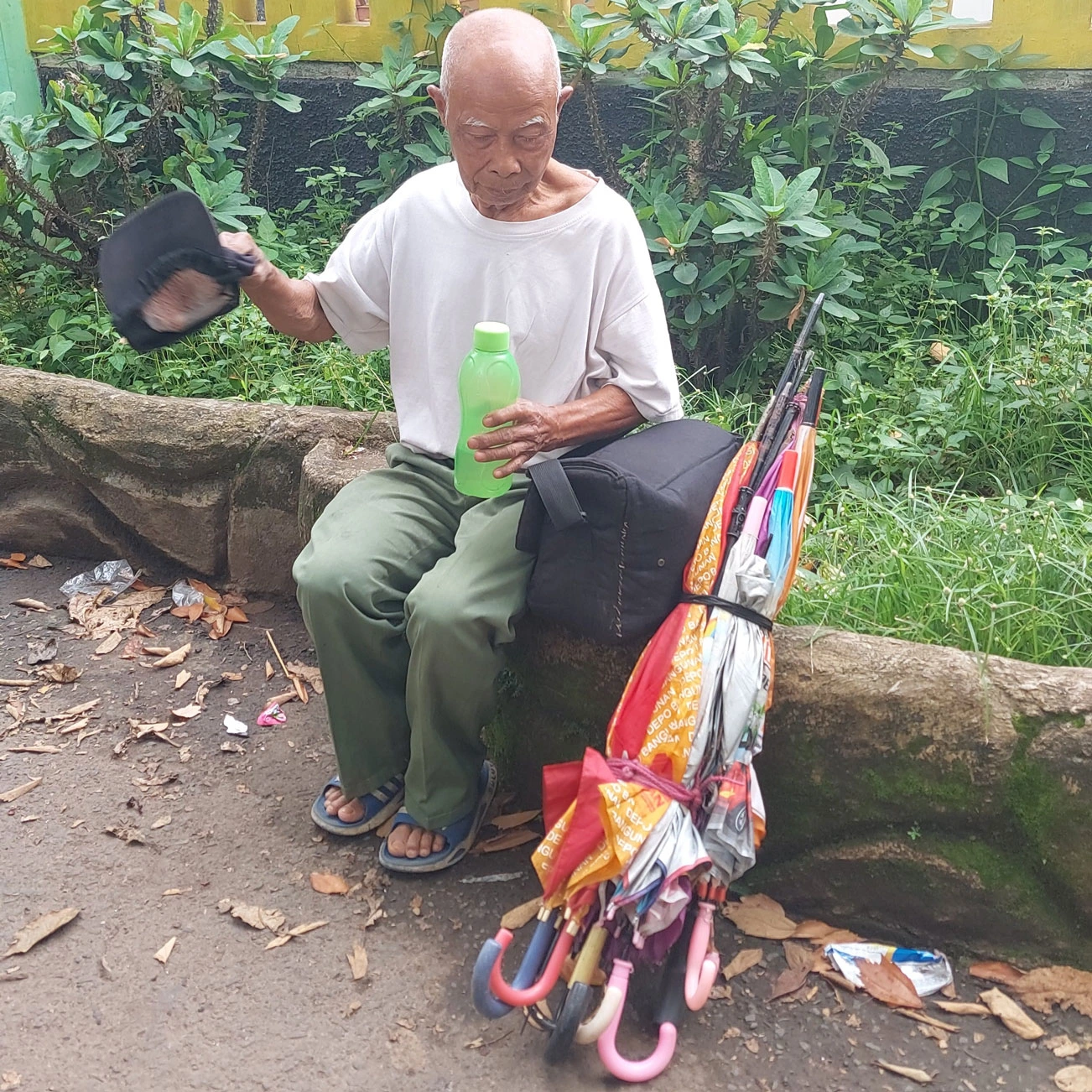 Setiap pagi, Abah Katiman sudah bersiap dengan peralatan sederhana yang ia bawa di dalam tas usangnya. Dengan tangan renta dan penglihatan yang mulai kabur, ia menawarkan jasa reparasi payung rusak.