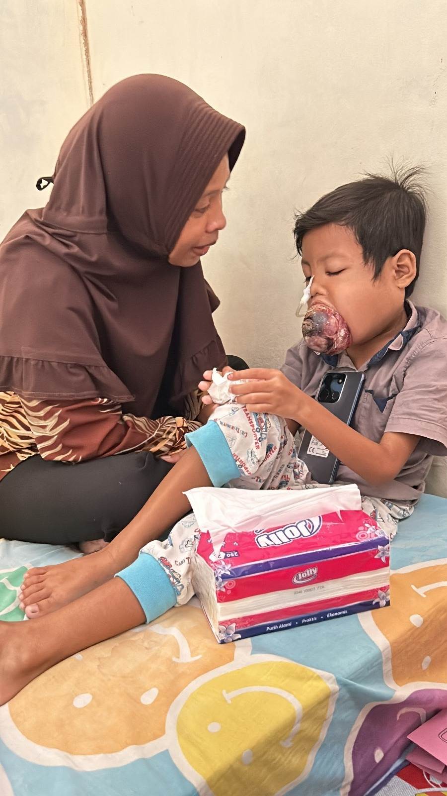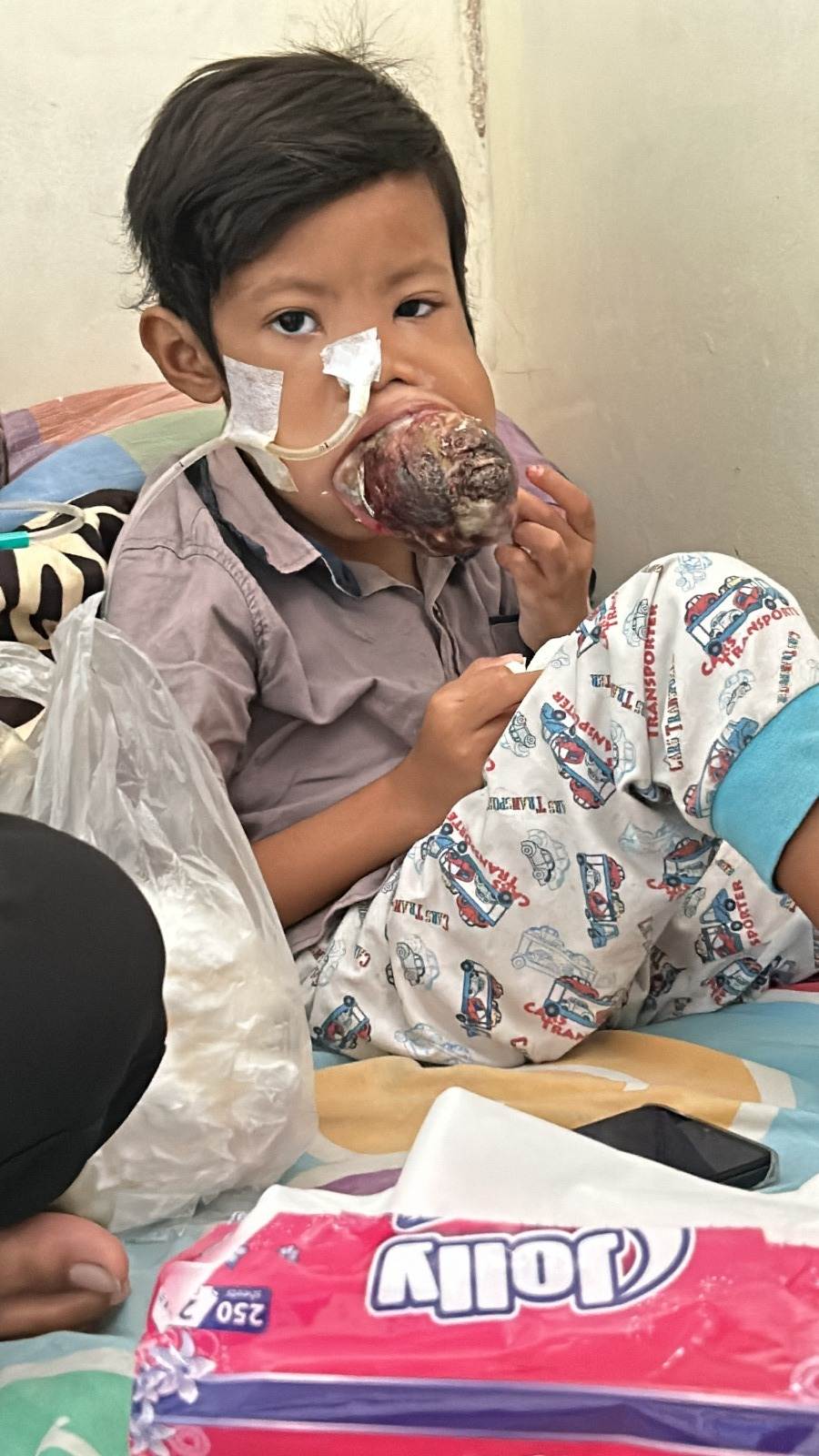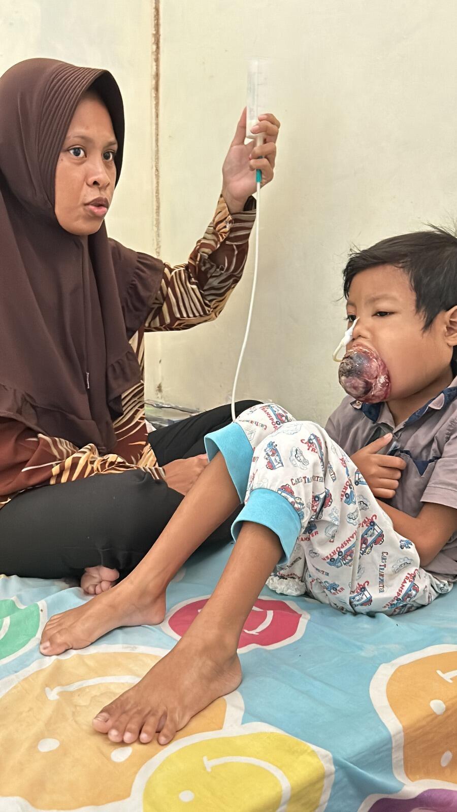 Aldi (6) menderita kanker mulut yang tumbuh dengan cepat, sel kanker bahkan tumbuh besar sampai memenuhi rongga mulut bahkan keluar dari mulutnya.