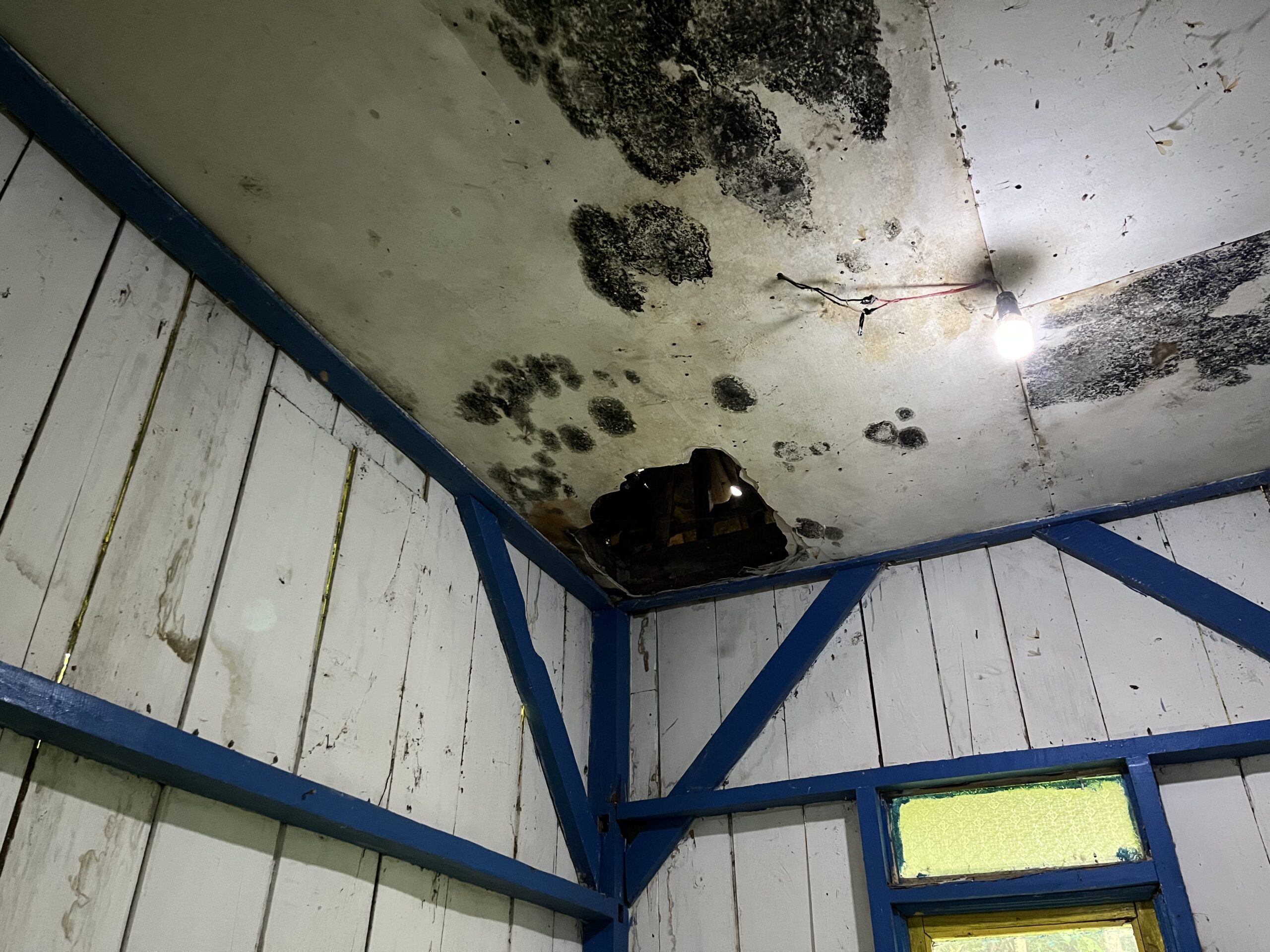 Setiap kali hujan turun, air mengalir masuk ke dalam masjid. Atap yang bocor, kayu penyangga yang lapuk, serta dinding yang berlubang membuat jamaah beribadah dalam rasa khawatir takut atap runtuh, takut bangunan roboh.