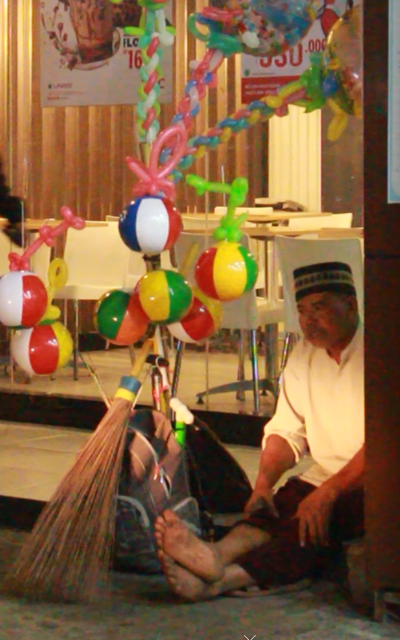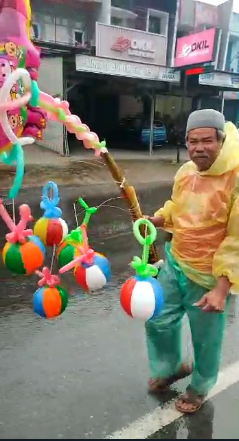 Demi menjual balon seharga sepuluh ribu rupiah.