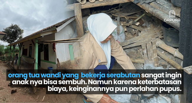 Berbagai upaya pengobatan telah ditempuh, mulai dari rumah sakit, puskesmas, hingga pengobatan tradisional. Namun keterbatasan biaya, kondisi fisik orang tua, serta sulitnya akses menuju layanan kesehatan membuat pengobatan lanjutan tidak lagi terjangkau. Kini, Wandi hanya bisa menjalani pengobatan sederhana, tanpa terapi rutin dan pemeriksaan medis yang memadai, sementara kondisinya terus berisiko memburuk.