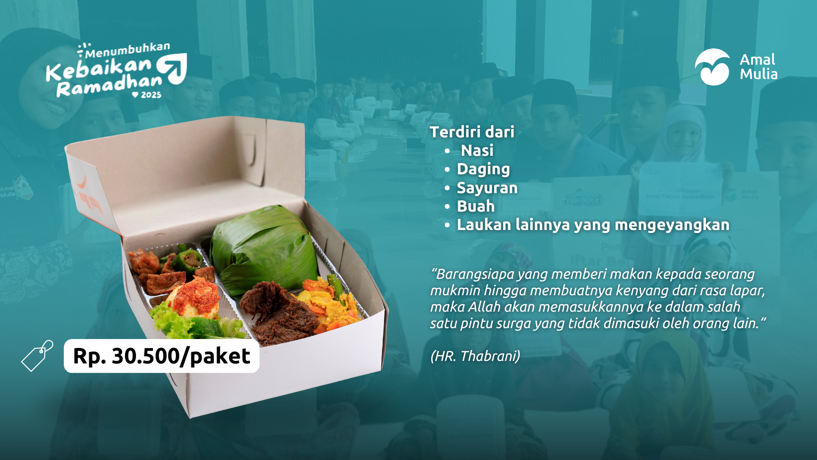 Dalam rangka menyemarakkan bulan Ramadhan dan berbagi kebahagiaan kepada sesama, Amal Mulia melaksanakan program Iftar Berkah Ramadhan untuk masyarakat dan santri dhuafa yang berada di daerah pelosok. Program ini bertujuan untuk memberikan kemudahan kepada mereka yang membutuhkan dalam berbuka puasa, sekaligus sebagai bentuk kepedulian terhadap sesama.