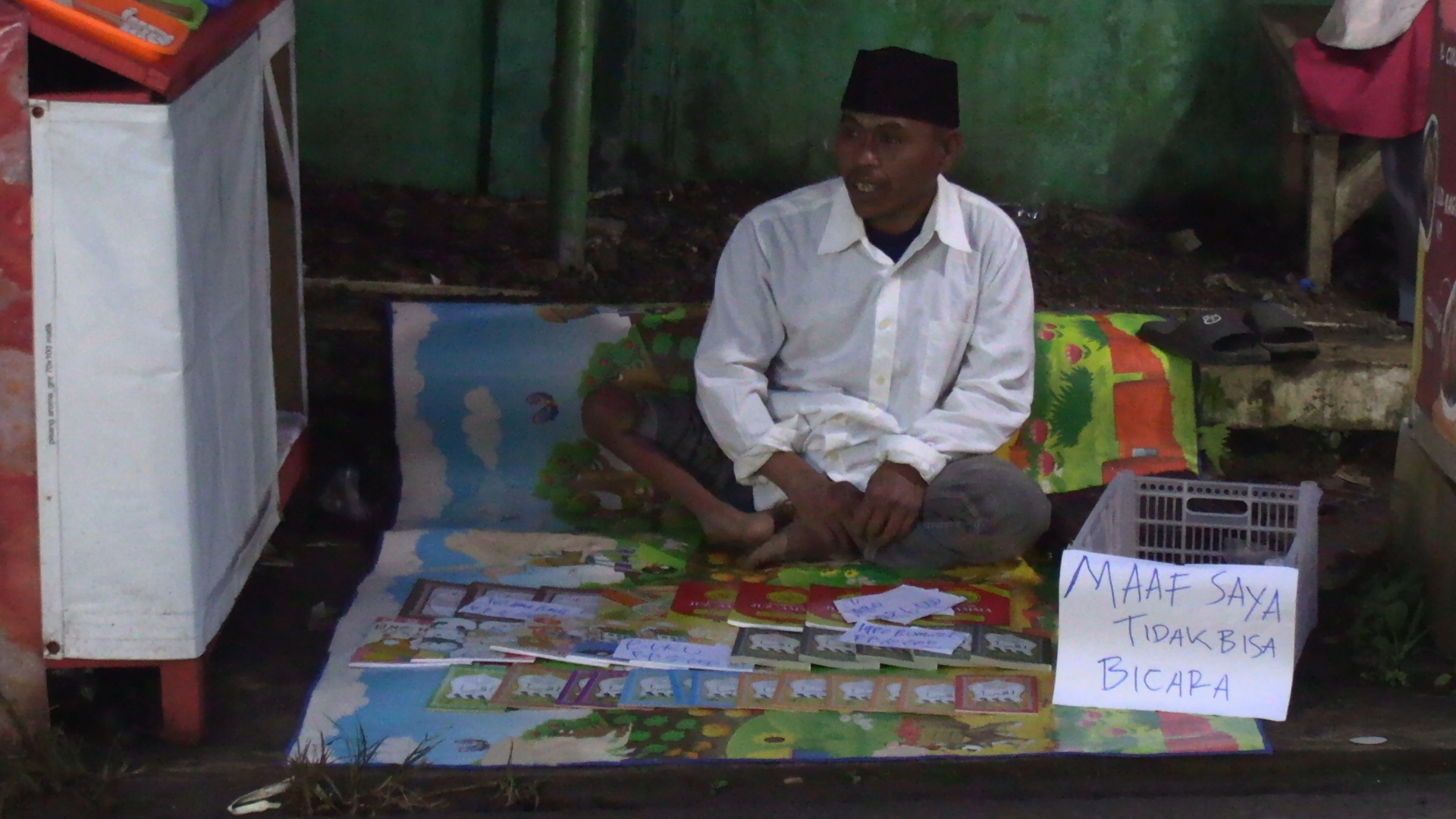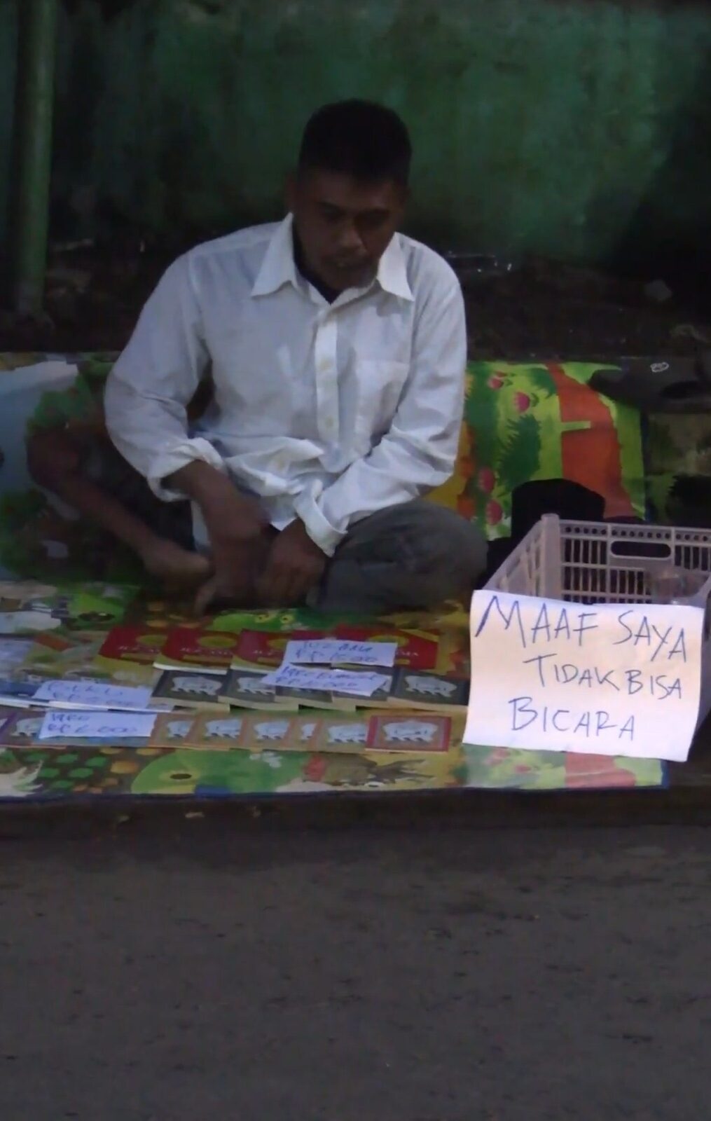 Di sudut jalan yang ramai, seorang pria duduk sederhana di samping tumpukan buku-buku pelajaran agama Islam. Namanya Asep, usia 36 tahun. Tubuhnya tidak mampu berdiri, dan lisannya tak bisa mengucapkan kata-kata. Namun dari matanya, terlihat jelas satu hal: ia masih ingin hidup dengan martabat.