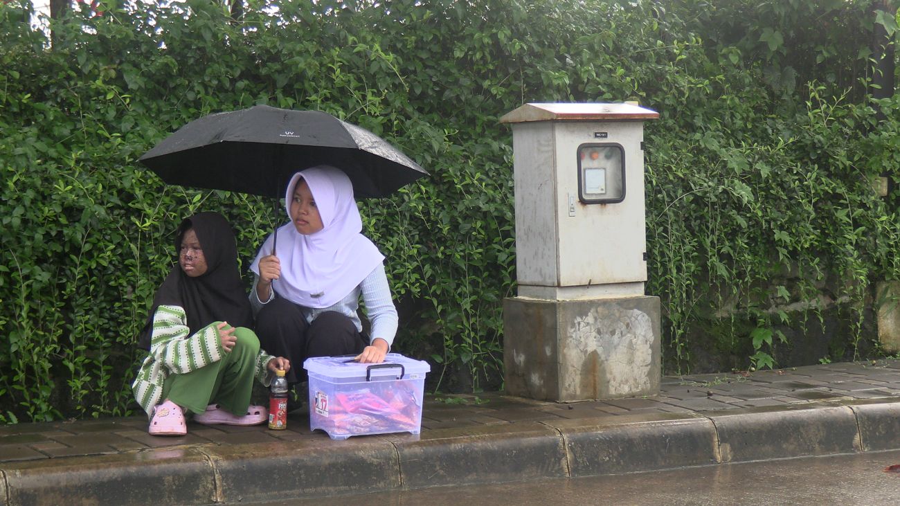 Novi berdiri sedikit lebih maju, memiringkan payung agar adiknya tidak kehujanan. Sesekali ia bercanda, tertawa kecil, berusaha mengalihkan perhatian Aqila dari rasa dingin dan perih di kulitnya. Di tengah derasnya hujan dan kerasnya hidup, tawa itu terdengar seperti doa yang tak terucap—doa agar hari esok lebih baik dari hari ini.