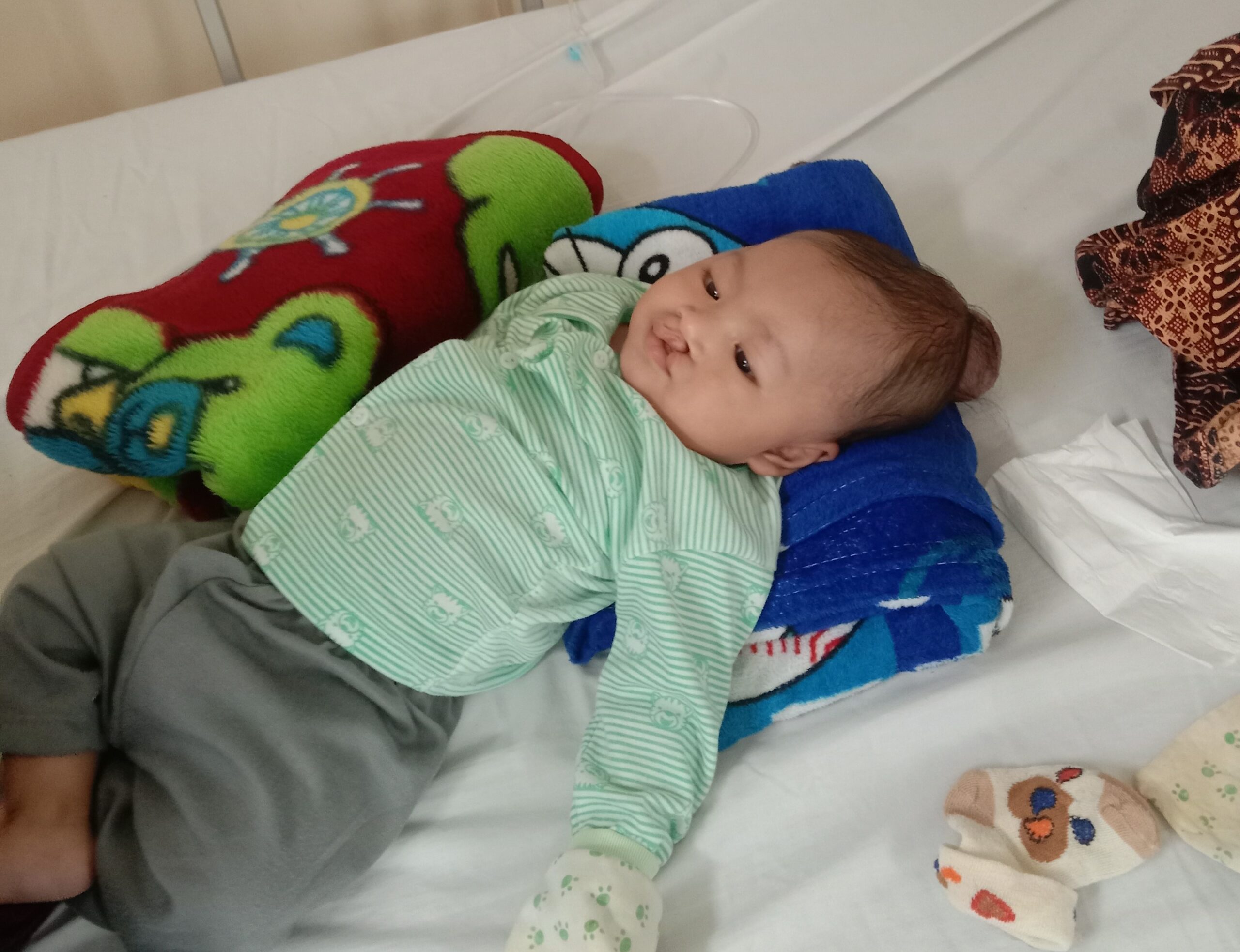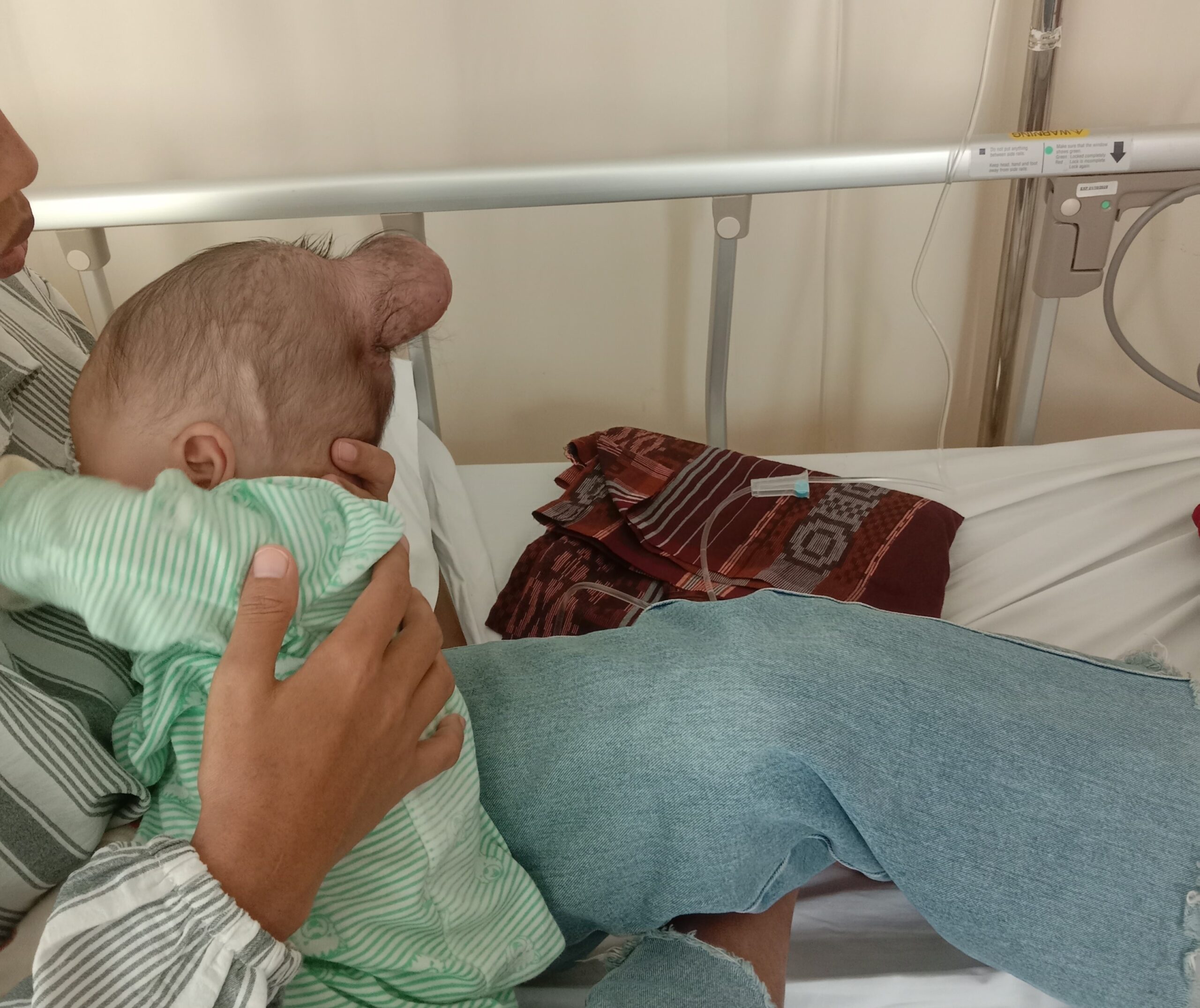 Adik Noval menangis setiap saat menahan sakit. Bayi berusia 4 bulan ini belum pernah merasakan sehat sejak lahir. Dia mengalami kelainan, timbul benjolan di belakang kepala sebesar telur puyuh.