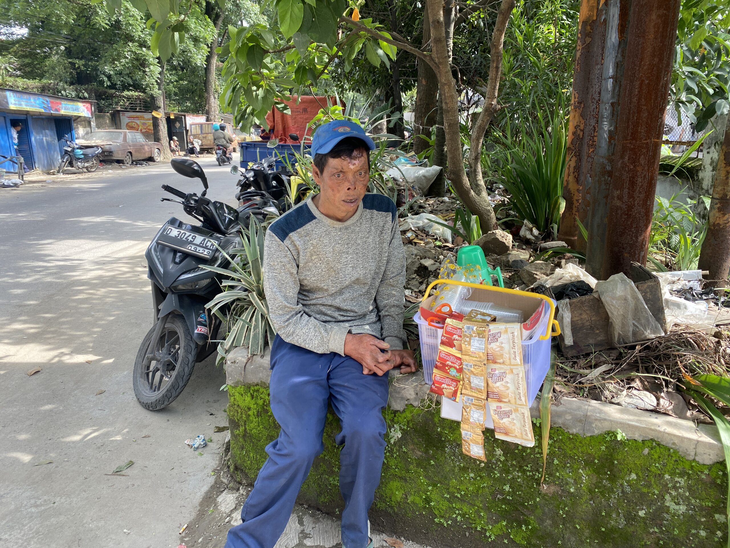 Pak Lili (52 tahun) pernah mengalami kecelakaan kerja terbakar hebat yang membuat 90% tubuhnya terbakar dan kini meninggalkan bekas luka yang memprihatinkan. Setelah pulih ia berjualan kopi seduh untuk menyambung hidup nya keluarga yang ditanggungnya. Sayang karena kondisi fisik yang ‘cacat’ tak jarang orang merasa takut bahkan mengucilkannya membuat dagangannya tak laku.