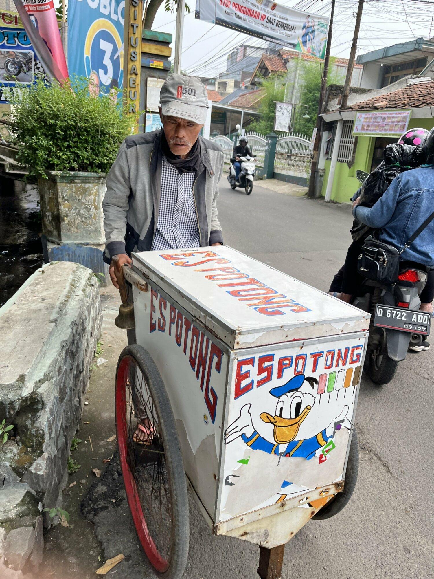 “Satu batang es potong ini untung buat bapak cuman 3000 dek, kalau sehari cuman 3 sampe 5 batang aja yang kejualnya.”