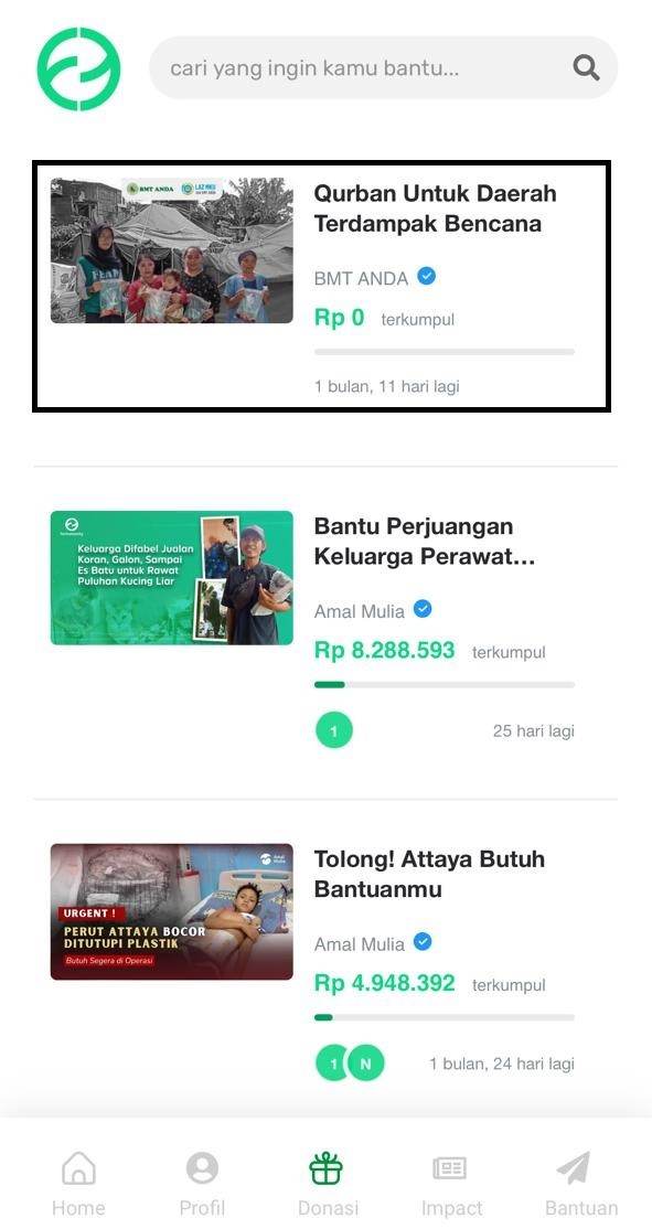 - Ketik ‘Qurban’ di kolom pencarian atau scroll untuk melihat program ‘Qurban’ yang sedang berjalan. Lalu klik.